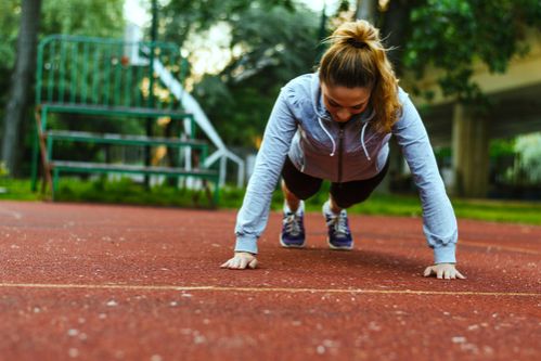 Pushups. To complete a simple pushup, start on your stomach. Push your body up with your arms and keep your back straight. The weight of your body on your arms encourages the chest muscles to strengthen.